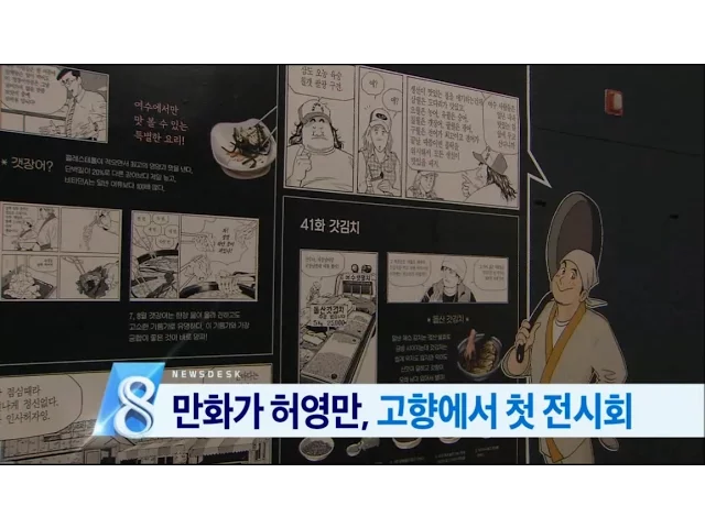 여수 출신 만화가 허영만 화백이고향에서 전시회를 열었습니다.각시탈과 타짜, 식객 등, 40년 만화 인생을 한자리에 모았습니다.///////////////////////////////////이순신 장군의 첫 부임지였던 발포진 터에 청렴 광장이 조성됩니다.장군의 청렴정신을 기리기 위한 것입니다.//////////////////////////////////////산업...