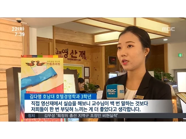 ◀ANC▶ 대학생들이 직접 호텔을 운영하는 교육프로그램이 한옥호텔인 영산재에서 펼쳐졌습니다. 학생 주도로 현장 실무를 익히고 호텔은 홍보라는 1석2조의 효과를 거두고 있습니다.문연철기자의 보도입니다. ◀END▶ ◀VCR▶ 앳띤 얼굴의 대학생들이 중국인 관광객의객실 예약과 입실...