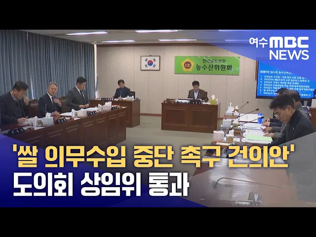 '쌀 의무수입 중단 촉구 건의안'이 오늘(6일) 전라남도의회 농수산위원회 심사를 통과했습니다.이번 건의안은WTO(세계무역기구) 농업협정에 따라 매년 40여만 톤의 쌀을 의무적으로 수입해야 하는 현행 제도의 중단을 정부와 국회에 강력히 요구하는 내용을 담고 있습니다.국내에는 1995년 우루과이라운드 협상 이후 지난해...