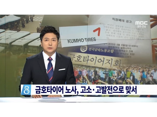 전면 파업과 직장폐쇄로 맞서고있는금호타이어 노사가결국 고소 고발전에 나섰습니다.금호타이어 노사에 따르면직장폐쇄 이후 대규모 집회 등을 이유로회사 소유 운동장 일부 시설물을무단 훼손하고, 제품 출하 등을 방해했다며 사측이 노조 대표와 일부 노조원들을 경찰에 고소했습니다.이에 대해 노조측도전면 파업이후 ...