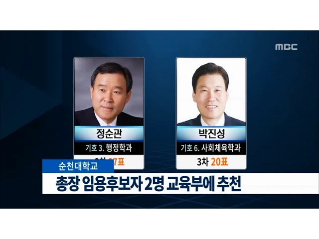지난 6월 첫 간선제로 선출된순천대 총장 임용후보자 2명이 교육부에 추천됐습니다.'순천대 총장임용후보자 추천관리위원회'는행정학과 정순관 교수와사회체육학과 박진성 교수에 대한연구 윤리 검증작업을 마치고,각각 1순위와 2순위 총장 임용후보자로교육부에 추천했다고 밝혔습니다. 정부는 후보들에 대한 신원조사와...