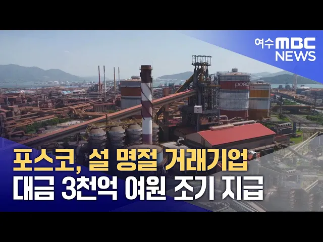 포스코가 설 명절 앞두고 거래기업 대금 3,000억 여원을 조기에 지급합니다.포스코는 다가오는 설 명절을 앞두고 오는 20일 부터 24일 까지 5일 동안의 거래 기업 지불 기준을 한시적으로 조정해 대금 3,000억 여원을 앞당겨 지급합니다.이번 조치는 포스코의 설비 자재와 원료 공급사, 공사 참여기업들을 대상으로 진행되...