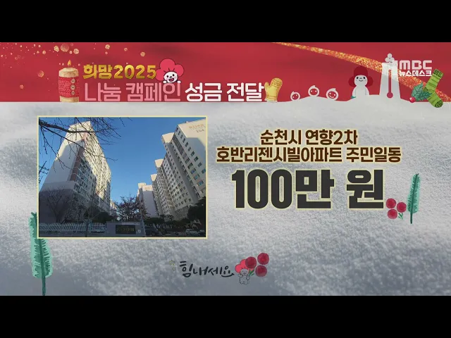# 뉴스데스크계속해서 희망 2025 나눔 캠페인에 성금 보내주신 분들입니다////////////////순천시 생목동 벽산아파트 주민일동 1,728,700 원////////////////순천시 덕연동 송보파인빌 주민일동 1,634,810 원////////////////광양백운고등학교 1,613,150 원////////////////광양병원장 김철호 1,000,000 원////////////////...