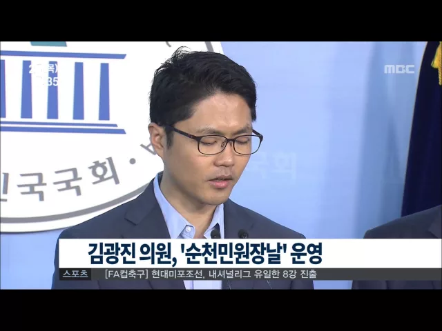 내년 총선에서 지역구 출마를 선언한새정치연합 김광진 의원이 시민 접촉을 넓히며적극적인 총선 행보에 나섰습니다.김 의원은 보도자료를 통해오늘(24일)부터 매주 수요일 순천지역사무실을 완전 개방하고 모든 직원들이 나서서 민원상담에서부터 각종 정보 제공까지 시민이 필요로하는 모든 것을 챙기겠다고 밝혔습니다....