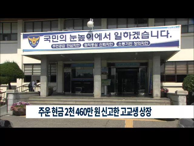 순천경찰서는 길에서 수천만 원의 현금을 발견하고 경찰에 신고한 벌교고등학교 17살 이기성 군 등 6명에게 전남지방경찰청장 상장을 전달했습니다.이 군 등은 지난 5월 22일 순천 시내를 지나다길에 떨어진 5만 원권 5다발, 2천460만 원을발견하고 근처의 남문파출소에 신고했으며,경찰은 CCTV 분석을 통해 주인에게 돌...
