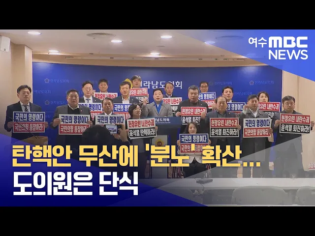 ◀ 앵 커 ▶윤석열 대통령에 대한 탄핵소추안 표결 무산에시민들의 분노가 사그라 들지 않고 있습니다.야당 소속 전남도의원들은 오늘(9)단식 농성에 들어갔고,시민들은 계속해서 대통령 탄핵에 목소리를 높이고 있습니다.김단비 기자입니다.◀ 리포트 ▶국민의힘 1명을 제외한더불어민주당, 진보당, 정의당 소속 전남도의원 59...
