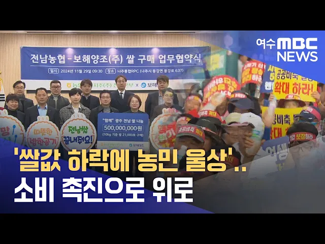 ◀ 앵 커 ▶산지 쌀값 하락세가 멈추지 않으면서 정부 대책을 요구하는 농민들의 목소리가 커지고 있습니다.이런 가운데 쌀 소비 촉진을 위해 지역 기업들이 동참하는 등 농민들의 아픔에함께하는 움직임이 일고 있습니다.박종호 기자가 취재했습니다.◀ 리포트 ▶이달 중순 통계청 자료에 나온 산지쌀값입니다.[반투]80kg 기준...