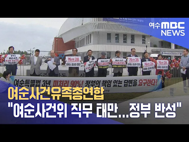 제76주기 여순사건 추념식을 앞두고여순사건위원회의 직무 태만을 비판하는 목소리가 커지고 있습니다.여순10.19항쟁 전국유족총연합은 오늘(15)전남동부청사에서 기자회견을 열고,희생자·유족 신고 가운데 최종 처리된 건 9.5%에 불과해나머지 90% 이상은 여전히 미처리 상태로 남아있다고 지적했습니다.유족들은이런 상황...
