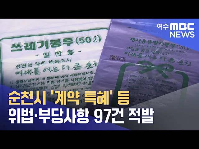 순천시에 대한 전라남도 종합감사에서 위법·부당 행정이 무더기로 확인됐습니다.전라남도는 순천시를 상대로 벌인 정기 종합감사에서 97건의 위법·부당 사항을 적발했으며, 공무원 14명에 대한 징계와105명에 대한 훈계를 요구하고,106억 원의 재정상 처분을 내렸다고 밝혔습니다.감사 결과 순천시는 쓰레기 종량제봉투 공...