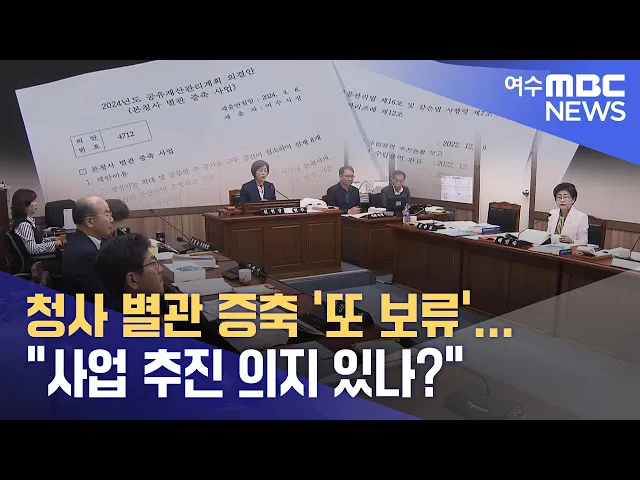 ◀ 앵 커 ▶여수시가 추진하고 있는 본청사 별관 증축 사업이지난 4월에 이어 또다시 시의회에서 보류됐습니다.시의원들은 여수시의 대응과 준비가 무성의하다며사업 추진 의지가 있는지 따져 물었습니다. 문형철 기자입니다. ◀ 리포트 ▶지난 4월 여수시의회 임시회에 상정된 여수시 본청사 별관 증축 안건입니다. 당시 상임...