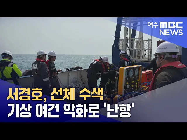여수 앞바다에서 침몰한제22서경호에 대한 선체 수색 작업이기상 악화 등으로 어려움을 겪고 있습니다. 전남도와 등에 따르면오늘(26) 새벽 민간 심해잠수사 2명은 서경호 선체까지 내려갔지만, 조타실 입구의 그물과 밧줄 등 장애물과 현지 기상 여건 악화로 선내까지 들어가지는 못했습니다. 전남도는 다음 달 21일까지민...