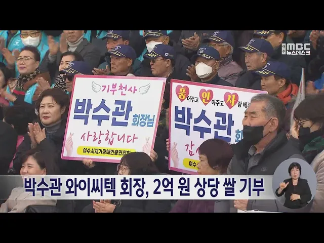 박수관 와이씨텍 회장이 설 명절을 맞아 여수지역의 어려운 이웃을 위해 2억 원 상당의 쌀을 기부했습니다.오늘(21) 박 회장은 사랑의 쌀 전달식에서지역의 소년소녀 가장과 장애인 등에게쌀 3천 570포를 전달했으며, 오는 23일은 부산을 방문해 쌀 2천 9백포를 기부할 예정입니다.여수 남면 출신으로여수세계섬박람회 민간...