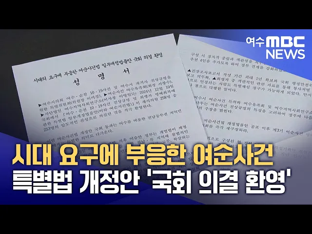 여수지역의 정치권과 시민단체들이 여순사건 특별법 개정안의 국회 통과는시대의 요구에 부응한 것이라며환영한다는 성명서를 잇따라 발표했습니다.여수시의회 여순사건 특위와 여순사건 여수유족회 등은 이번 특별법 개정안의 국회 통과를 통해제3기 여순사건 명예회복위원회 즉각 재구성과 진상조사보고서 작성기획단 해...