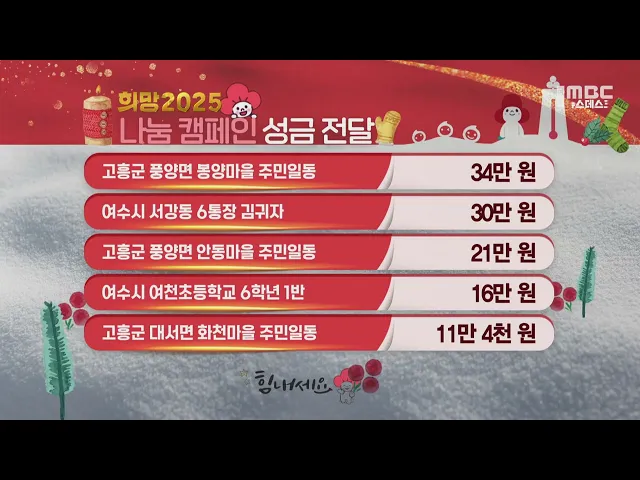 # 뉴스데스크계속해서 희망 2025 나눔 캠페인에 성금 보내주신 분들입니다////////////////전남낙농농협 조합장 강동준 및 직원일동 1,530,000 원////////////////고흥군 대서면 장선마을 주민일동 600,000 원고흥군 풍양면 고옥마을 주민일동 550,000 원순천시 신대유치원 교직원 및 유아일동\t 490,700 원여수시 경호초등...