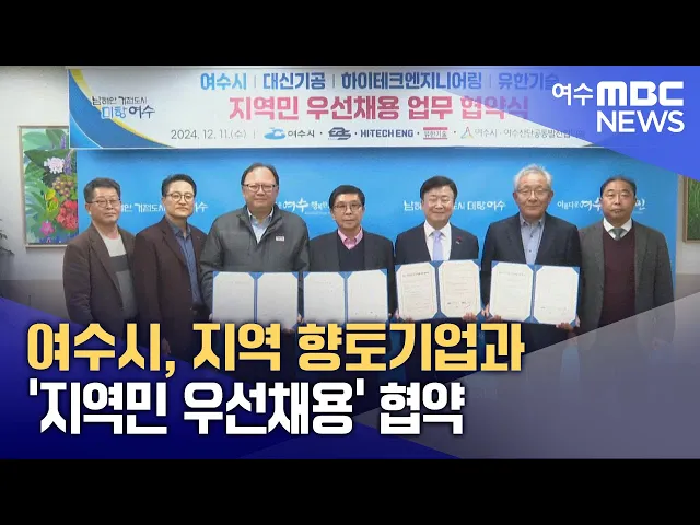 여수지역 향토기업 3곳이여수시와 지역민 우선채용 협약을 체결했습니다.여수시는 최근, 대신기공과 하이테크엔지니어링, 유한기술 등, 3군데 향토기업과 지역 인재의 산단 기업 취업률 제고와 인구 증가 기여를 위한여수산단기업 지역민 우선채용 협약을 맺었습니다.여수시는 지금까지총 37개 기업과 지역인재 우선채용 협...