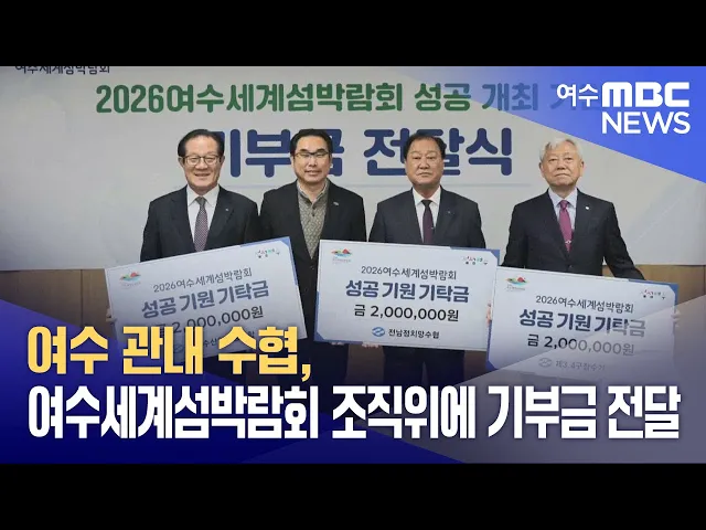 여수시 관내 업종별 수협이릴레이 기부 방식으로여수세계박람회 조직위원회에기부금을 전달했습니다.2026여수세계섬박람회 조직위원회는 최근여수수협과 정치망수협, 제3.4구 잠수기 수협 등,3개 수협이 섬박람회 성공개최를 위한 지원과 응원의 뜻으로각각 2백만 원씩의 기부금 전달식을 가졌다고 밝혔습니다.이에 앞서 지...