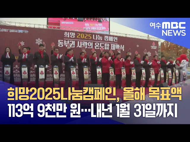 희망2025나눔캠페인을 알리는 전남 동부권 사랑의 온도탑이 여수에 설치됐습니다.여수시는 최근, 시청 현관 앞에서 모금액 113억 9천만 원을 목표로희망2025나눔캠페인 사랑의 온도탑 제막식과 함께,㈜스타테크와 여수광양항만공사, 유투버 여수언니봄날엔 등,9천5백만 원의 첫 기부금 기탁식을 가졌습니다.올해 성금 모금...