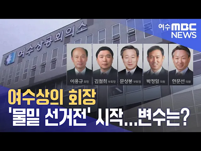 ◀ 앵 커 ▶ 여수상공회의소 신임 회장 선거가 넉 달 앞으로 다가왔습니다. 지난 2021년 당시, 과열 선거로 적지 않은 잡음과 논란이 일었는데요. 여러 인사들이 후보로 거론되면서 벌써부터 물밑 경쟁이 시작되는 모양새입니다. 문형철 기자입니다. ◀ 리포트 ▶ 내년 3월 초 치러질 예정인 여수상공회의소 신임 회장 선거. 선...