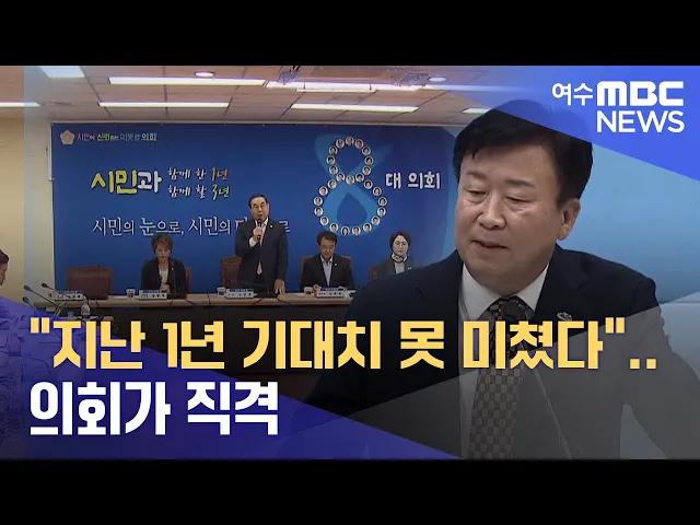 ◀ANC▶ 제 8대 여수시의회가 지난 1년을 돌아보며 갑˙을 지역 의원들 간 분열된 모습을 보인데 대해 고개를 숙였습니다. 그러면서도 여수시의 일부 공무원들의 일탈과 함께 각종 현안에 대한 소극적인 행정을 두고 기대에 못미쳤다고 직격하며, 의회의 감시와 견제 기능을 강화하겠다는 의지를 밝혔습니다. 김주희 기자가...