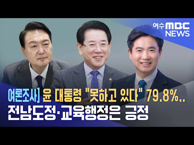 ◀ANC▶ 민선 8기 1년을 맞아 저희 여수MBC가 실시한 여론조사, 오늘(5) 마지막 순서로 대통령과 국회의원, 전남도지사 등에 대한 민심을 전해드립니다. 윤석열 대통령의 국정 운영에 대해 전남동부권 시민 10명 중 8명은 부정적으로 평가했습니다. 전남도정과 교육행정에 관한 평가에서는 긍정적인 답변이 높았는데요. 김...