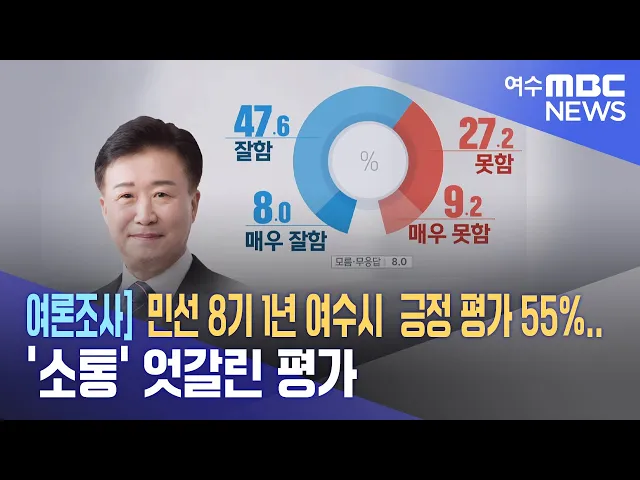 ◀ANC▶ 저희 여수MBC는 민선 8기 1주년을 맞아 전남도˙전남동부 자치단체들의 정책 운영에 대한 평가와 함께 내년 총선을 앞두고 지역 민심을 살펴보는 여론조사를 실시해 오늘부터 사흘에 걸쳐 전해 드립니다. 오늘은 첫번 째 순서로 여수시의 지난 민선 8기 1년 동안의 시정에 대해 지역 민심이 어떤 평가를 하고 있는 ...