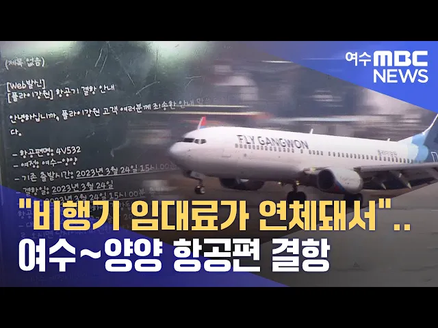 ◀ANC▶ 오늘 여수를 출발해 강원도 양양으로 향하는 비행기 노선이 갑자기 결항돼 승객들이 큰 불편을 겪었습니다. 플라이강원의 비행기 임대료 연체 때문에 벌어진 일인데, 승객들은 제대로 된 안내도 받지 못한 채 비행기 대신 버스에 몸을 실었습니다. 보도에 김단비 기자입니다. ◀VCR▶ 여수공항 내 플라이강원 안...