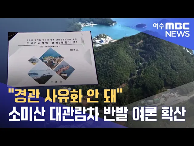 ◀ANC▶ 불법 난개발 논란이 일었던 여수 돌산 소미산 대관람차 사업이 다시 추진되면서 지역사회의 반발 여론이 확산되고 있습니다. 어제(13) 여수지역 시민사회단체는 불법 개발 이력이 있는 특정 업체가 소미산 경관을 사유화해선 안 된다며 여수시에 책임있는 허가 행정을 요구했습니다. 강서영 기자입니다. ◀VCR▶ ...