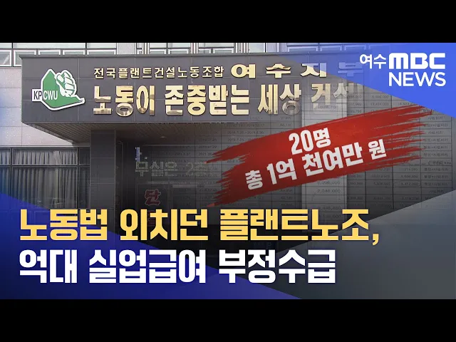 뉴스데스크 타이틀 ========================================== 여수지역의 한 노동조합 간부들이 파업기간 중에 실업급여를 부정수급한 사실이 드러났습니다. 해당 노조 내부의 반발이 확산되고 있습니다. =========================================== 여수지역의 또 다른 노조에서는 위원장이 급여를 이중으로 받았다는...