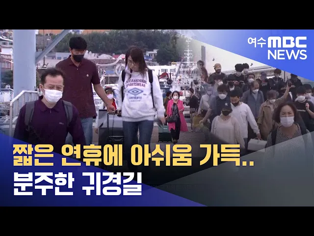 ◀ANC▶ 올해 추석 연휴도 오늘은 마지막 날인데요. 고향 방문객들과 관광객들도 서둘러 귀경에 나섰습니다. 나흘간의 짧은 연휴였던 만큼 귀경객들의 표정엔 어느 때보다 아쉬움이 묻어났습니다. 강서영 기자입니다. ◀VCR▶ 승객을 실은 여객선들이 터미널에 차례로 도착합니다. 출구가 열리자 짐을 바리바리 든 승객들...