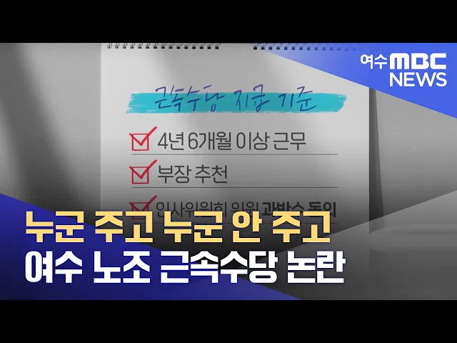 뉴스데스크 타이틀 ======================================= 여수의 한 노동조합이 조합비 유용 의혹에 이어 이번에는 근속수당 지급을 두고 논란에 휩싸였습니다. 조합원들 사이에서 근속수당 지급에 대한 형평성 문제가 제기됐기 때문입니다. ======================================== 코로나19가 한창일 때 문을 연 순...