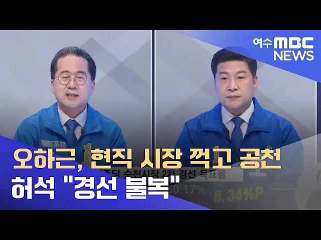 ◀ANC▶ 도의원 출신의 오하근 후보가 현직 시장인 허석 후보를 누르고 민주당 순천시장 후보로 결정됐습니다. 허석 후보는 지역위원장인 소병철 의원의 경선 개입 의혹을 주장하며 불복 입장을 밝혔습니다. 문형철 기자입니다. ◀VCR▶ 민주당 순천시장 후보로 도의원 출신의 오하근 후보가 결정됐습니다. [C/G - 투명] ...