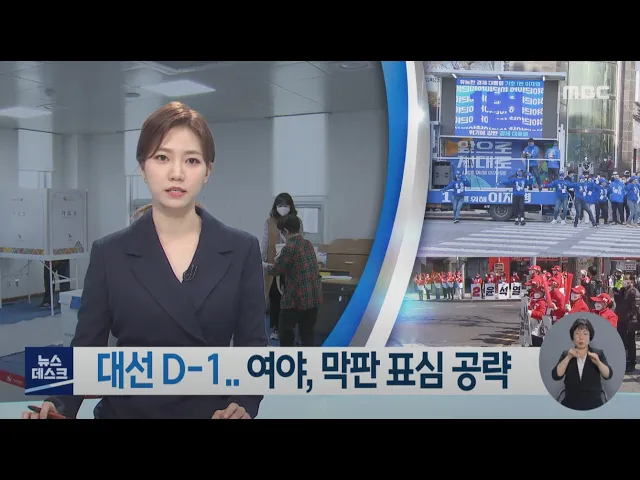 ◀ANC▶ 내일이면 대한민국의 새 대통령을 뽑는 제 20대 대선의 본투표가 시작됩니다. 선거운동 마지막 날인 오늘(8), 민주당과 국민의힘은 도심 골목 골목을 돌며 마지막까지 지역 표심 확보를 위한 총력 유세에 나섰습니다. 강서영 기자입니다. ◀VCR▶ 투표를 하루 앞둔 오늘(8) 더불어민주당은 지역구 의원들까지 모...