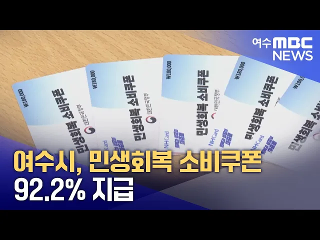 여수지역 민생회복 소비쿠폰 지급률이 90%를 넘어섰습니다.여수시는 어제(5)까지 전체 지급 대상자의92.2%에 해당하는 24만 3천여 명에게 473억여 원의 쿠폰을 지급했다고 밝혔습니다. 지급 수단별로는 신용·체크카드 충전이 전체의 50.7%로 가장 많은 비율을 차지했고,선불카드 24%, 종이형 상품권 18.4% 등의순이었습니다...
