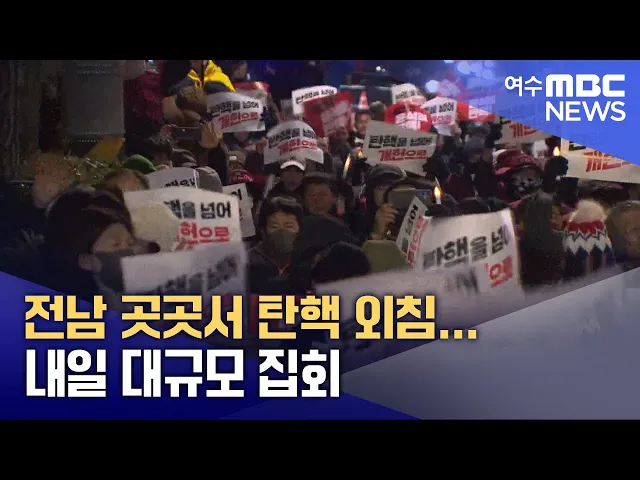 대통령 탄핵을 요구하는 시민들의 목소리가 전남에서도 확산하고 있습니다.오늘(13) 저녁,여수시청 로터리와 광양 중마동 23호 광장,순천 국민은행 사거리와 고흥 청소년문화의집 인근에서탄핵 집회가 열렸습니다.두 번째 탄핵소추안 표결이 진행되는 내일도순천시민 만명 총궐기대회와 함께여수 흥국체육관 앞에서는 대규...