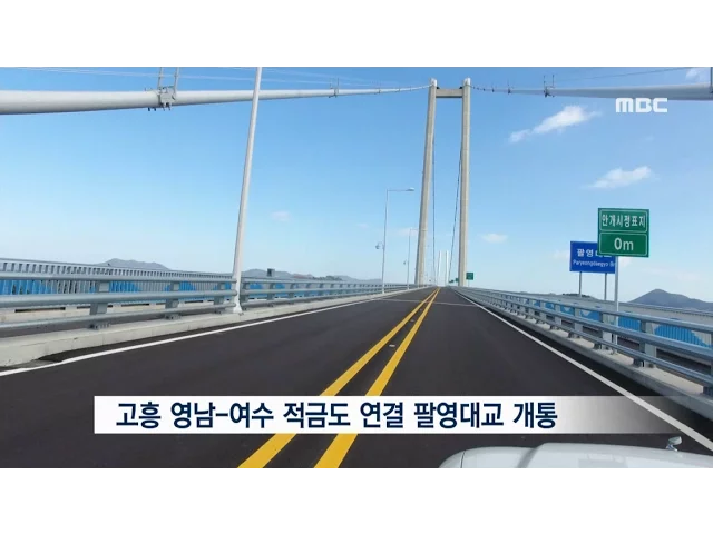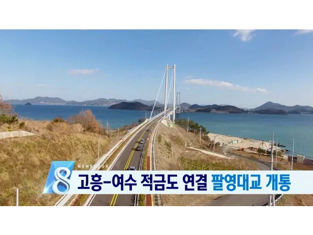 1.고흥과 여수 적금도를 잇는 팔영대교가 오늘 개통됐습니다.오는 2천20년까지 필영대교를 포함해11개 다리로 여수와 고흥을 연결하는사업을 펼치고 있지만 쉽지 않아 보입니다.///////////////////////////////////////2.순천시는 올 한해생태를 접목한 문화, 예술 도시로 새로운 방향을 제시했습니다.역점 시책으로 추진...