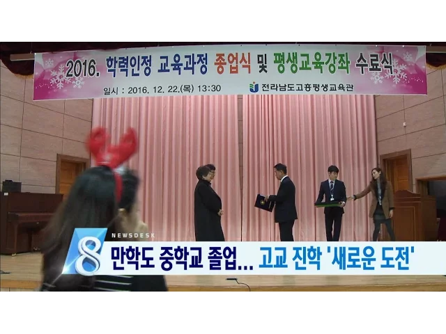 고흥에서는 5,60대 예비 고등학생들이향학열을 불태우고 있습니다.폐교 위기의 시골 학교가 이들 만학도들 덕분에 명맥을 유지하게 됐습니다.///////////////////////////////////광양시의 2016년은 청년 일자리와 보육 정책에 특히 치중했던 한해였습니다.다양한 시정 성과는평가와 비판이 엇갈리기도 했습니다.//////////...