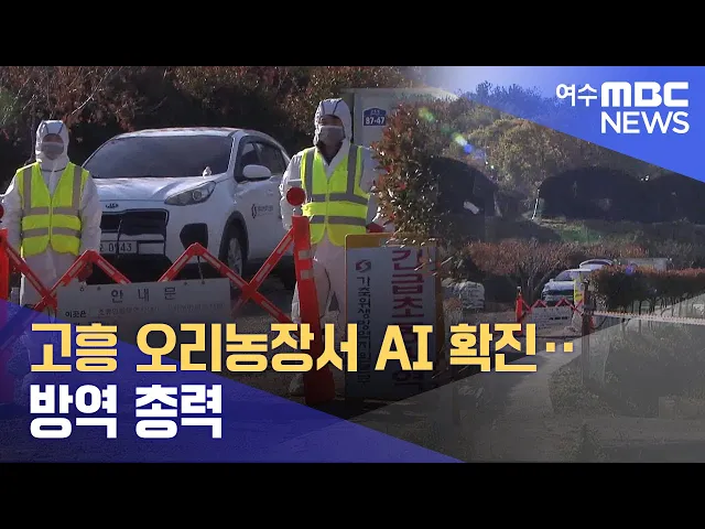 ◀ 앵 커 ▶ 전남 고흥의 한 오리농장에서 올해 겨울 들어 처음으로 고병원성 조류 인플루엔자, AI가 확인됐습니다. 방역당국은 농장 출입을 통제하고 인근 철새 도래지를 소독하는 등 확산 방지에 총력을 기울이고 있습니다. 유민호 기자입니다. ◀ 리포트 ▶ 출입이 통제된 고흥의 한 오리농장. 흰 방역복을 입은 요원들이 바...