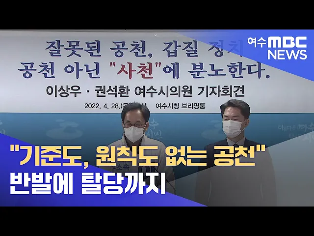 ◀ANC▶ 민주당 기초의원 경선 후보자 선정을 두고 비판과 반발이 끊이지 않고 있습니다. 공천 심사에서 탈락한 예비후보들 가운데 일부는 지역위원장인 국회의원을 강하게 비판하며 탈당과 무소속 출마를 선언했습니다. 문형철 기자입니다. ◀VCR▶ 민주당 여수갑 지역위원회 소속인 이상우 여수시의원이 탈당을 결정했...