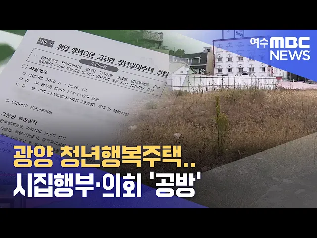◀ 앵 커 ▶광양시가 도시 정주 기반 조성 사업의 하나로 청년들에게 고급형 임대 주택을 공급하는행복타운 조성 사업을 추진하고 있는데요.광양시의회는 시가 지방채를 발행하면서까지 청년 공동주택을 신규 건축하는 것이 적절치 않다고 반대하고 나서 시 집행부와 의회 간 공방이 일고 있습니다.김주희 기자가 보도합니다....