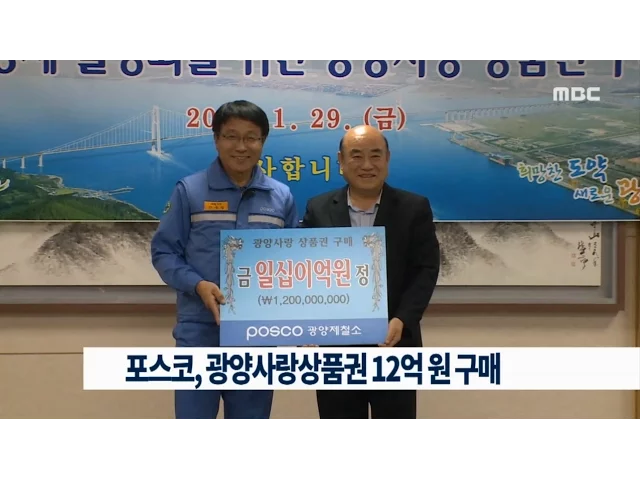 포스코 광양제철소가 지역의 설 경기 활성화를 위해 12억원 상당의 광양사랑상품권을 구매하기로 했습니다.광양제철소는 최근 광양시와 구매 협약을 맺고전량을 명절 전에 소속 직원들에게나눠주기로 했습니다. 광양사랑상품권 카드는 지역내 상거래 활성화를 위해 사용처를 광양시로 제한한 전자식 카드로 지난 2008년 ...