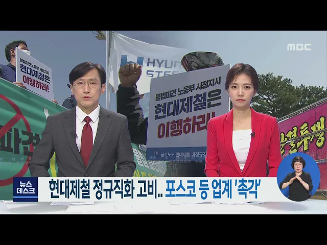 ◀ANC▶어제(23) 현대제철 비정규직 노조의 정규직 전환 투쟁에 대해 전해드렸는데요. 이 사건이 노동계에 갖는 의미가 큽니다. 포스코 사내하청지회는 이미 이번 현대제철의 사례를 토대로 진정을 준비하는 등, 벌써부터 다수의 대기업 하청업체에 파장이 일고 있습니다. 조희원 기자입니다. ◀VCR▶정규직 인정을 받은...