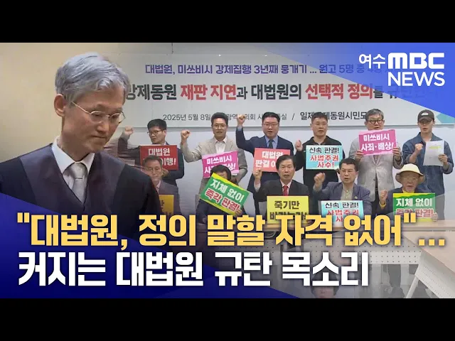◀ 앵 커 ▶더불어민주당이 조희대 대법원장을 상대로 청문회를 열겠다고 밝힌 가운데 대법원을 규탄하는 목소리가 점점 커지고 있는데요.광주에서도 일제강제동원 피해자 단체를 중심으로 대법원이 정의를 운운할 자격이 없다며강도 높은 비판이 이어지고 있습니다.천홍희 기자가 취재했습니다.◀ END ▶◀ 리포트 ▶일제강제동...
