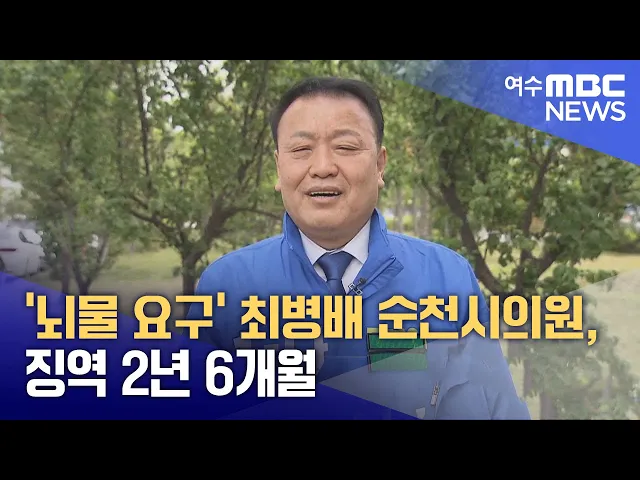 민원 편의를 대가로거액을 요구해 재판에 넘겨진최병배 순천시의원이1심에서 징역형을 선고 받았습니다.광주지법 순천지원은 오늘(20)공갈·강요·특가법상 뇌물 등 혐의로 구속 기소된 최 의원에게징역 2년 6개월을 선고했습니다.최 의원은 지난해 4월민원 편의를 대가로 태양광 사업자로부터9천900만 원을 받기로 약속한 혐...
