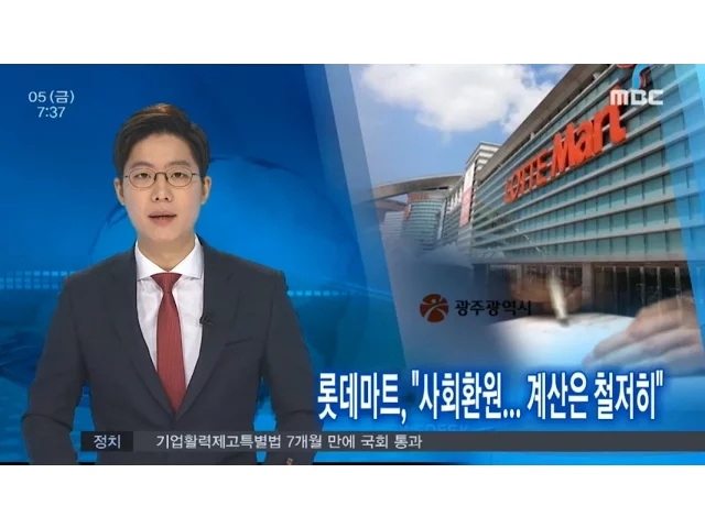 (앵커)롯데마트가 광주 월드컵점의 불법 재임대를 인정하면서도사회환원 규모는 철저히 계산해보자는 입장을 밝혔습니다. 앞으로 광주시와 환원금 규모를 놓고 줄다리기를 하게 될 가능성이 커졌습니다. 김인정입니다. (기자)승인 받은 면적을 초과해 매장을 불법 재임대해 수십억원의 부당이득을 챙겼다는논란에 휩싸인 롯...