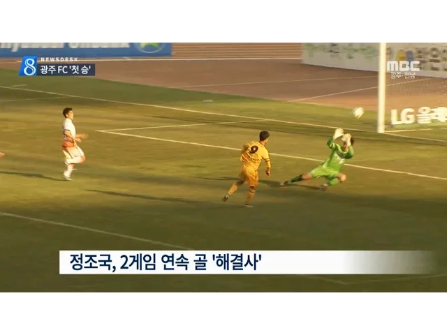 (앵커멘트)시민구단 광주FC가 제주 유나이티드를 상대로 홈 개막 경기에서 1:0으로 승리했습니다.정조국 선수는 2게임 연속골로 광주의 해결사로 발돋움하고 있습니다.박재욱 기잡니다.(기자) 팽팽한 승부가 이어지던 후반 19분,정조국의 슈팅이 제주 골망을 흔듭니다. (EFFECT)올 시즌 영입된 정조국 선수는 지난 12일 포...