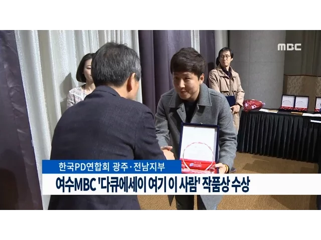 저희 여수MBC 제작 프로그램인'다큐에세이, 여기 이 사람'이 한국 PD연합회 광주·전남지부의'TV 정규부문 작품상'을 수상했습니다. 광주·전남지부는 "우리 주변의 평범한 사람들의 삶을섬세하고 밀도있게 전달해시청자들에게 잔잔한 울림을 줬다"며선정 이유를 설명했습니다.이와 함께 'TV부문 기술인상'에는여수MBC 기술...