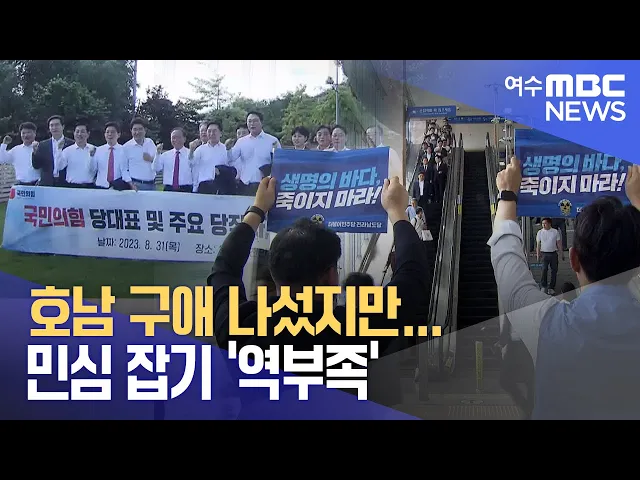 ◀ANC▶ 이렇게 국민의힘 지도부가 순천을 찾아 호남 민심잡기에 나섰지만 싸늘한 반응이 적지 않습니다. 국민의힘 내부에서도 정부와 당이 변하지 않으면 내년 총선에서 선전을 기대하기 어렵다는 목소리가 나오고 있습니다. 문형철 기자입니다. ◀VCR▶ 기차역을 빠져나오는 국민의힘 지도부를 향해 시민단체 관계자들...