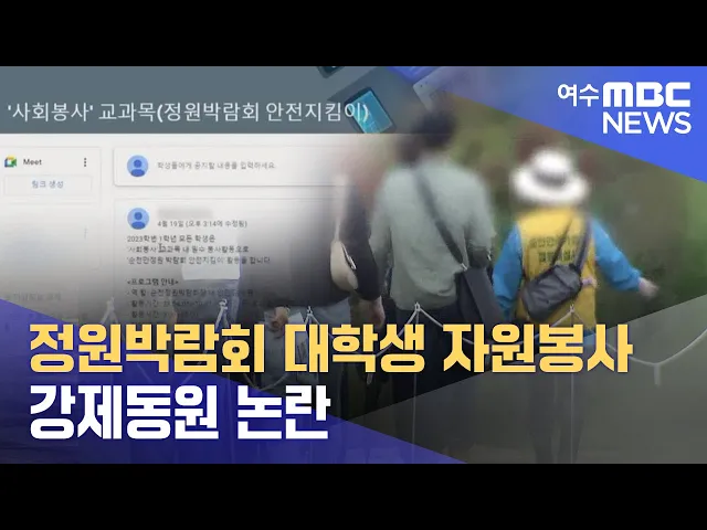 ◀ANC▶ 정원해설사나 안전요원 등 순천만정원박람회에서는 많은 자원봉사자들이 활동하고 있는데요. 순천의 한 대학에선 봉사활동을 명목으로 학생들을 박람회에 동원했다는 논란이 일고 있습니다. 강서영 기자입니다. ◀VCR▶ 순천의 한 대학교의 사회봉사 교양과목 소개 홈페이지입니다. 해당 과목을 이수하려면 정원...