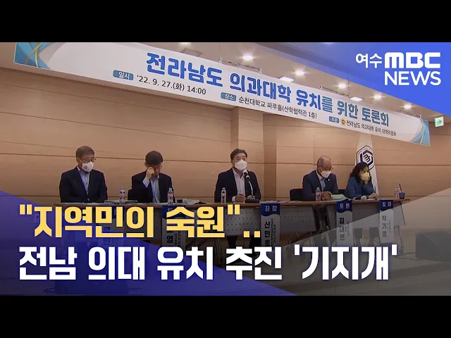 ◀ANC▶ 어제(27) 순천대학교에서는 전남형 국립의과대학의 추진 방향을 논의하는 토론회가 열렸습니다. 새 정부 출범 이후 주춤하던 의과대학 유치 추진 움직임이 다시 기지개를 펴는 모양샙니다. 강서영 기자입니다. ◀VCR▶ 전라남도의회는 어제(27) 순천대학교에서 의과대학 유치 방안을 논의하는 토론회를 열었습니...