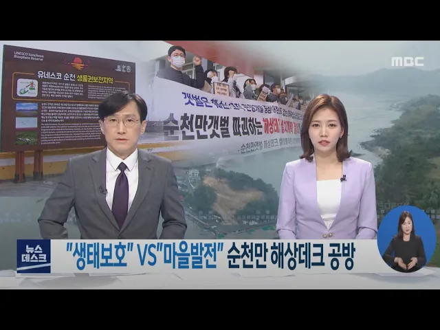 ◀ANC▶철새의 낙원이자 바다 생태계의 보고인 순천만에 해상 데크를 건설하는 사업이 추진돼 논란이 일고 있습니다. 마을 주민들은 관광 소득을 기대하며 찬성하고 있지만, 환경단체는 생태도시라는 슬로건에 역행하는 사업이라며 반발하고 있습니다.조희원 기자입니다. ◀VCR▶구불구불한 리아스식 해안선을 따라 광활...